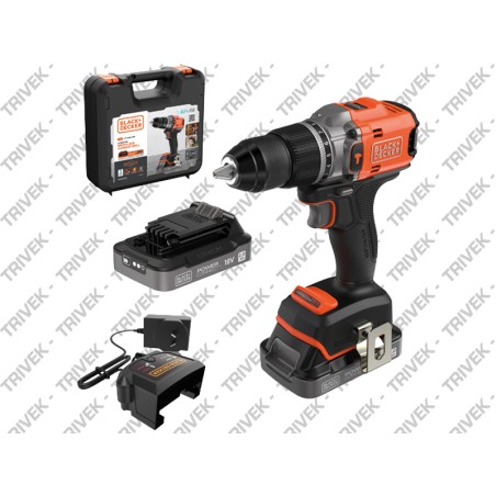 Motore Brushless 25% in più di autonomia fra una ricarica e l'altra, 50% di potenza aggiuntiva per un lavoro più rapido. Batteria ricaricabile 18V - 1,5Ah. Percussione 28.050 colpi/min. Mandrino autoserrante 1-13 mm. Reversibile. 2 velocità meccaniche 0-420 / 0-1.650 giri/min. Regolazione coppia di serraggio 23 + foratura. Torsione 52 Nm. Impugnatura soft grip. Luce led integrata. Massima foratura su metallo 10 mm. Massima foratura su legno 25 mm. In dotazione: caricabatterie per ricarica in 3-5 ore, 2 batteria al Litio 18V - 1.5Ah, inserto per avvitare a doppia funzione, valigetta.