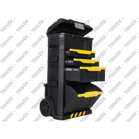 Oggetto in polipropilene, composto da: cassetta superiore con cassetto cassettiera centrale a 2 cassetti (1 alto) vano base ad apertura basculante maniglione telescopico in alluminio cassetti con guide di scorrimento in acciaio con cuscinetti a sfera per uso intenso tasche posteriori per utensili lunghi (segacci e livelle).